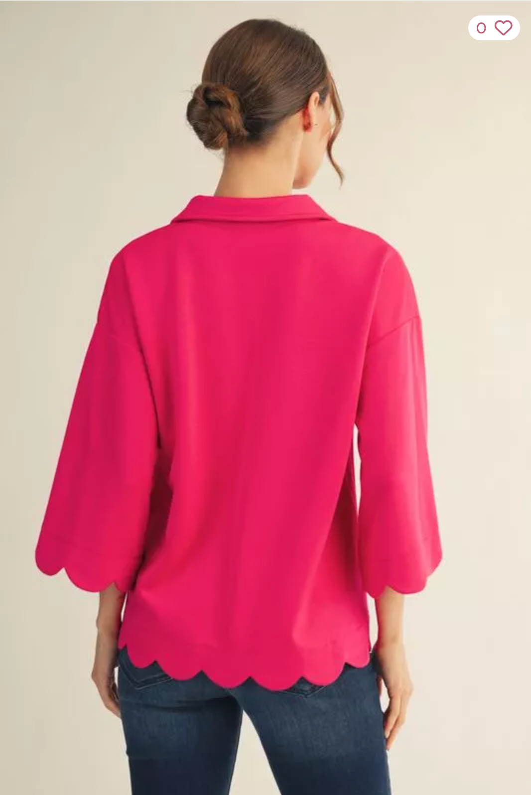 Elevate your everyday style with the Danny 3/4 Sleeve Top—a chic blend of comfort and sophistication. Designed in a buttery-soft scuba fabric, this top drapes beautifully with a loose, true-to-size fit that flatters every shape. The collared neckline and v-neck front give it a polished edge, while the scalloped sleeve detail adds just the right touch of feminine charm. Just a fan fav!!