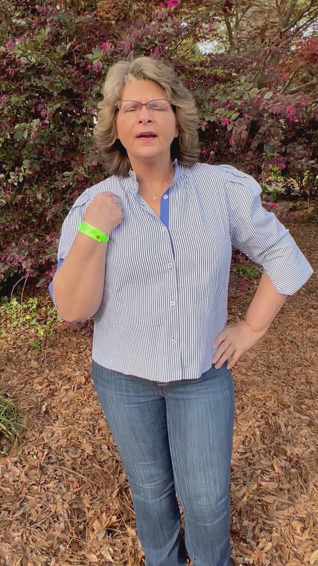 Elevate your everyday look with the Sophie Button Down Top — a chic blend of timeless style and modern femininity. Featuring crisp vertical stripes, a ruffled stand-up collar, and a front button closure, this blouse is effortlessly elegant. The inverted back pleats create a flattering, flowy silhouette, while the 3/4 tucked sleeves with slit band cuffs bring in a classic touch. It's so good that it's available in 3 colors: Blue, navy and mocha.