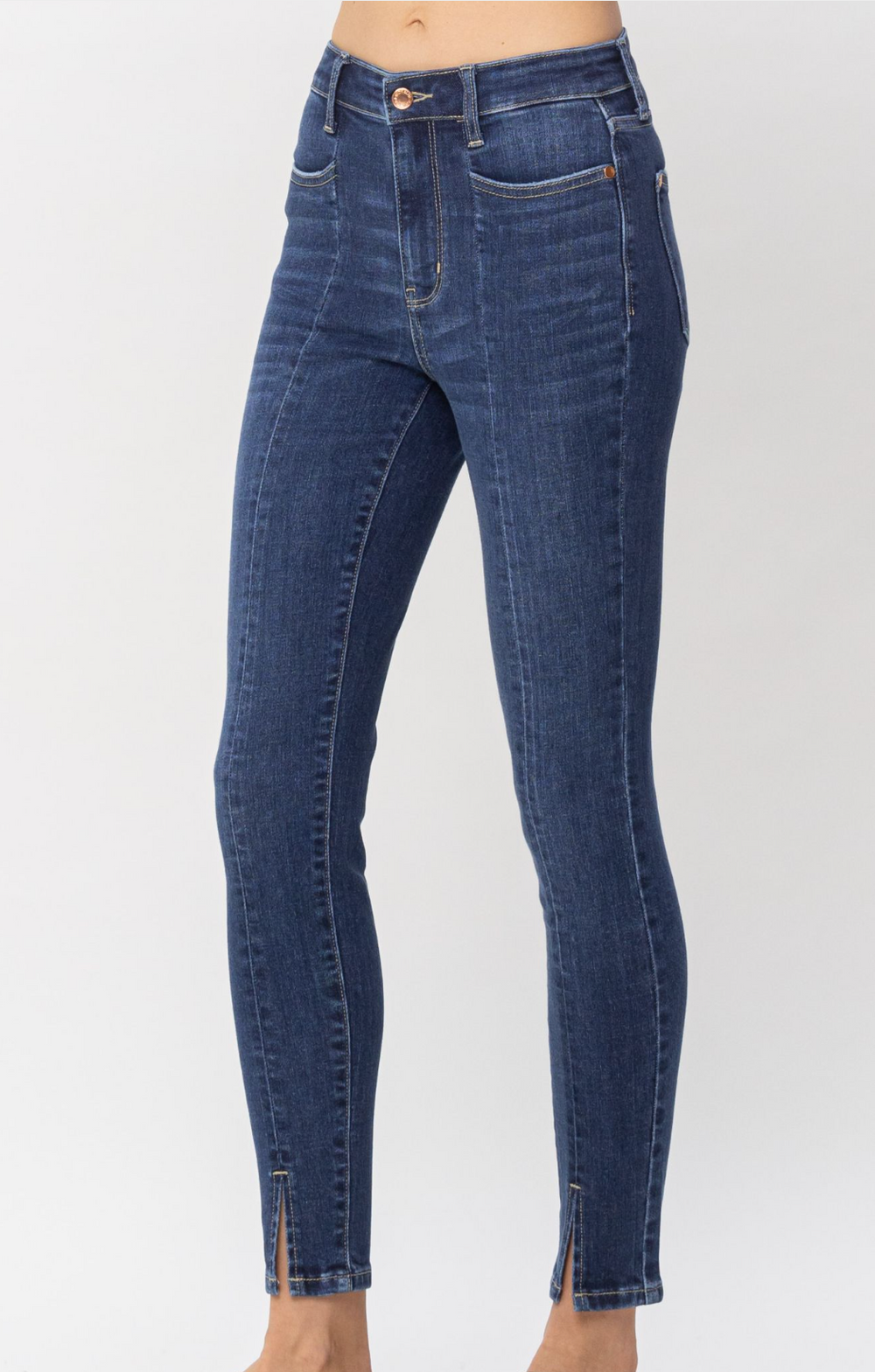 Get ready to rock these Judy Blue High Waist Skinny Jeans, girls! Featuring a stylish middle seam, functional pockets, and a trendy slit at the bottom, they're the perfect mix of fashion and function. And don't worry about sizing - just go with your true Judy Blue size. Get ready to slay in these cute and quirky jeans! FINAL SALE.