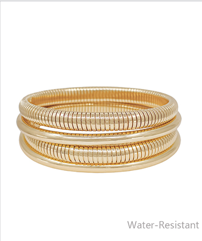 Add some flair to your outfit with our Annabelle Water Resistant Stack Bracelets! This trendy set of 4 stretch and bangle bracelets is available in both gold and silver, making them the perfect versatile accessory for any occasion. And with their water resistant feature, you can rock them all the time!