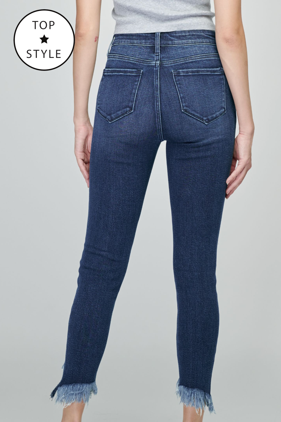 - Set the trends with these customer favorite mid-rise cropped dark denim jeans that end in an extremely frayed hem. Additionally equipped with five pockets, belt loops and a zip fly closure. Typically runs a size smaller - Stretchy fabric.