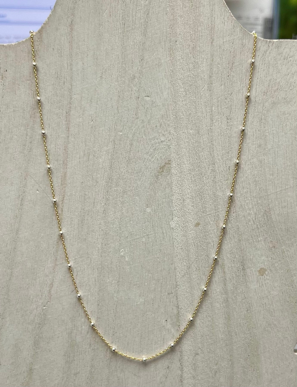 Add a touch of elegance to your outfit with the Demi Gold Filled Bead Necklace. Featuring delicate gold beads or silver beads throughout the chain. This dainty necklace is ideal for layering and comes in both 16" and 18" lengths. Elevate your style with this dainty accessory.
