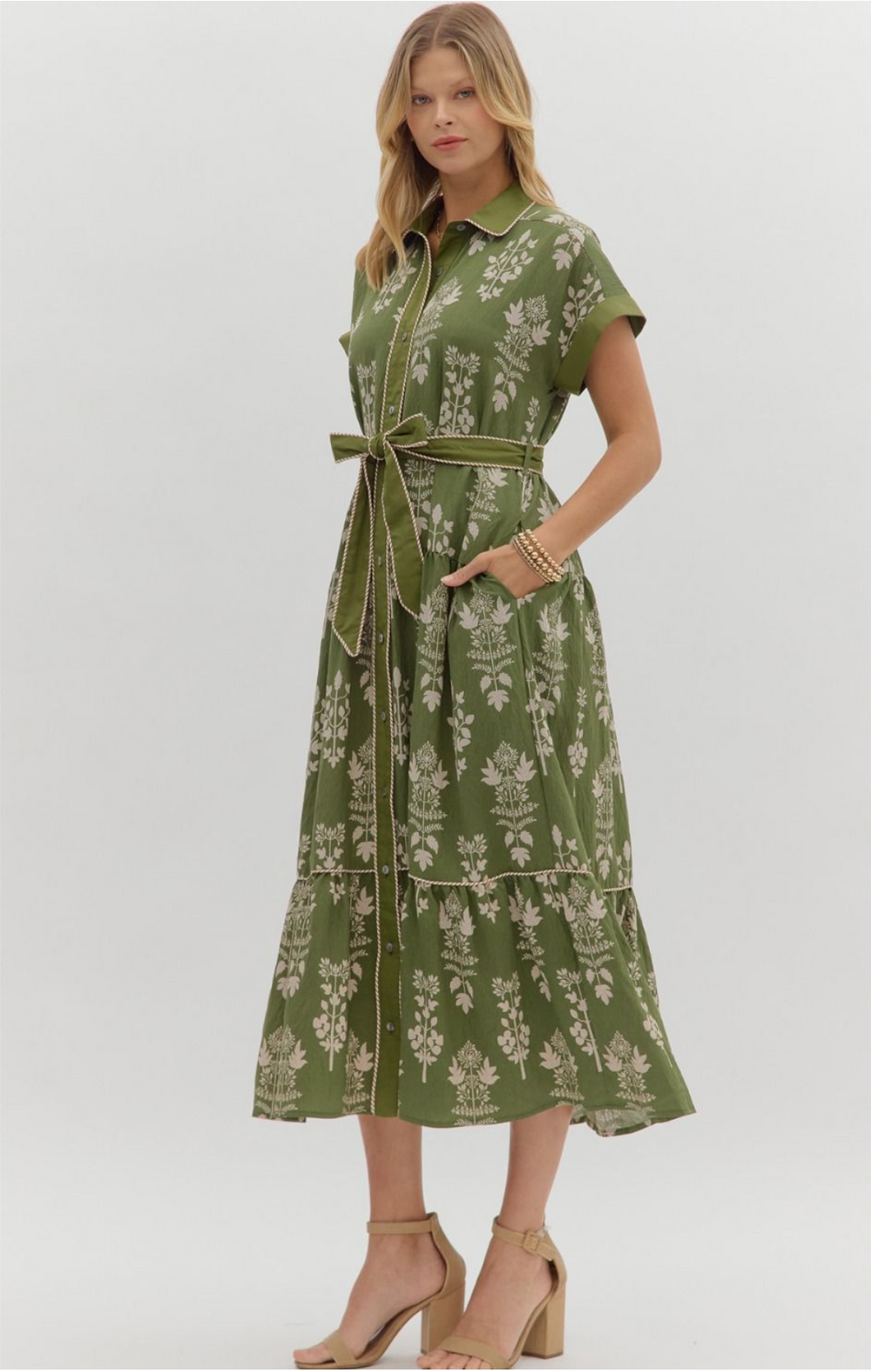 Turn heads with the effortless elegance of our Cooper Maxi Dress, the perfect blend of timeless charm and everyday comfort. Showcasing a beautiful botanical pattern with striped accent piping trim throughout, this dress is designed to flatter and make a statement. The faux roll-up short sleeves with a wide band add a chic touch, while the collared button-front closure keeps the look classic and refined.