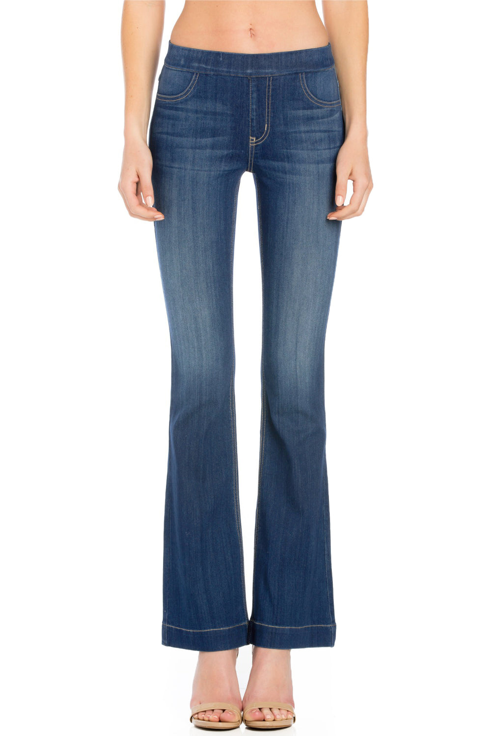 - These jeans give you that perfect vintage look! The dark denim flared jeggings features an elastic waist band, faux front pockets, and that perfect flare at the bottom. Dress them up with a cute pair of wedges or dress them down with sandals.