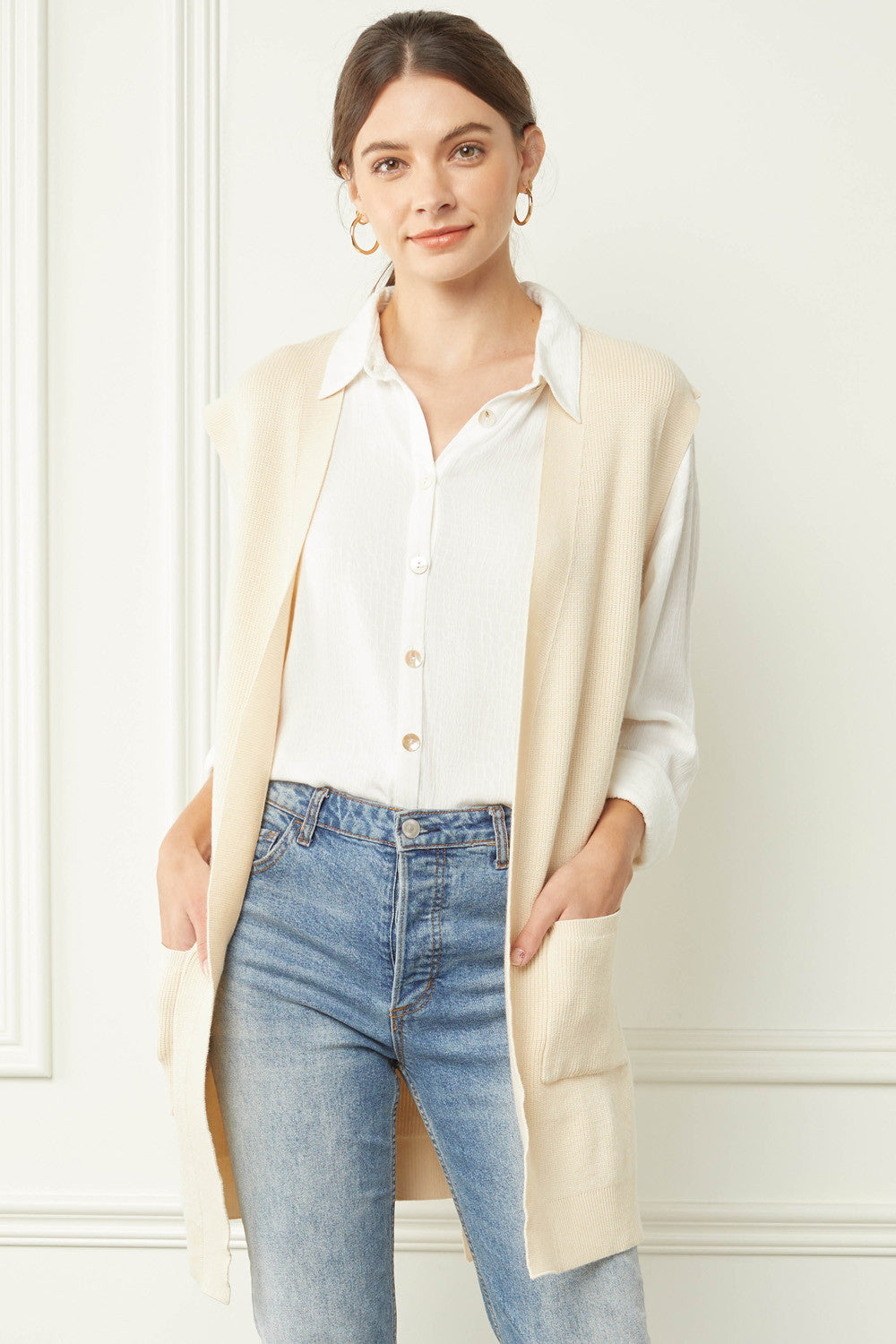 • What a great layering sweater vest. Solid ribbed open front vest featuring self tie detail at waist. Pockets at front. Slits at sides. Unlined. Knit. Non-sheer. Lightweight.