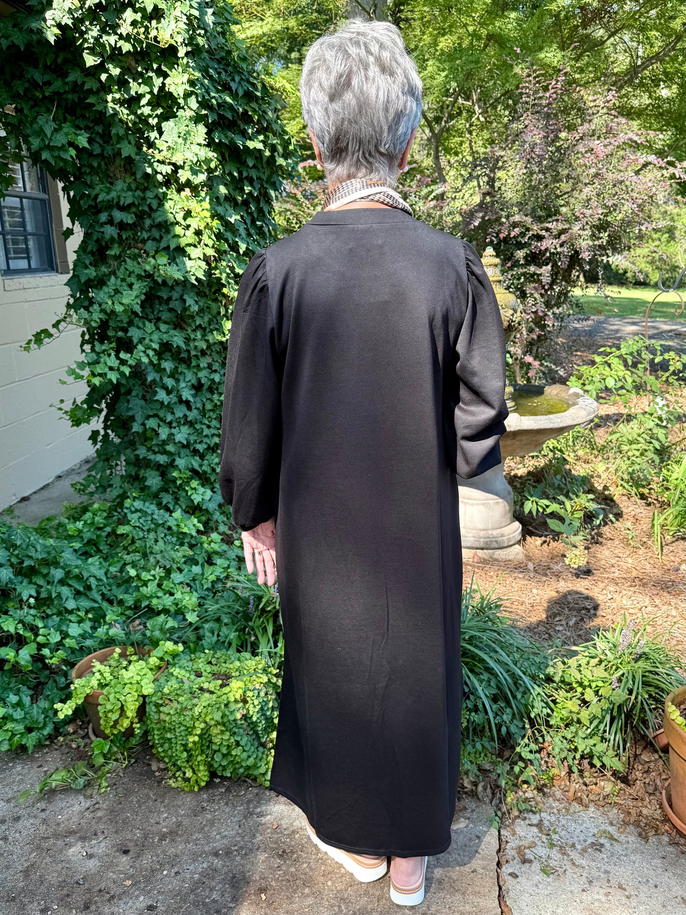 Madeline Midi Dress — Effortless Elegance Meets Everyday Comfort. Step into timeless style with our Madeline Midi/Maxi Dress — a soft, scuba-knit beauty that blends classic charm with modern comfort. Featuring long puff sleeves and a round neckline, this solid black midi dress delivers a sleek, flattering silhouette with just the right touch of sophistication.