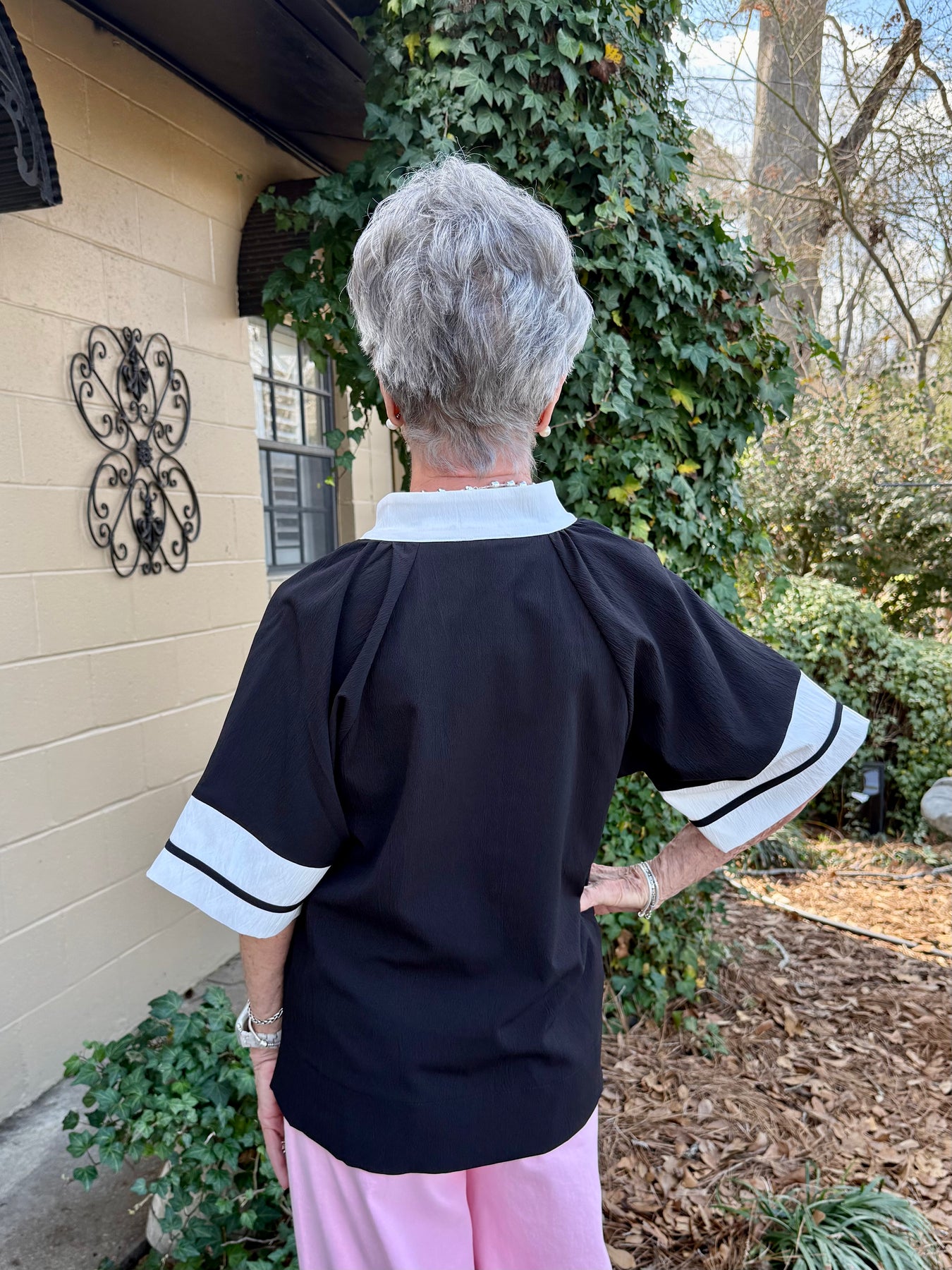 • Unique color blocking — crisp white contrast trim frames the neckline and cuffs for a polished, eye-catching finish
