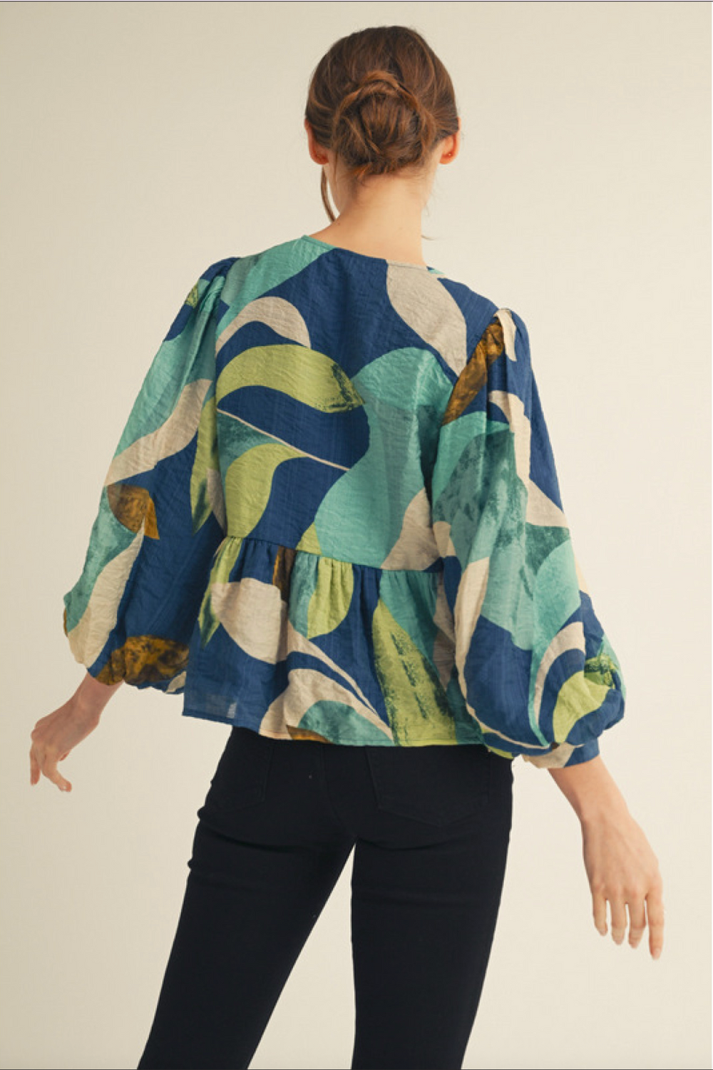This eye-catching Peplum Tie-Front Top features playful 3/4 balloon sleeves and a stunning abstract multicolor print that’s full of personality. The flattering peplum cut gives you that cinched waist moment we all live for, while the front bow tie detail adds just the right amount of charm (with a hidden modesty panel behind the ties—because we’ve got you, girl!).