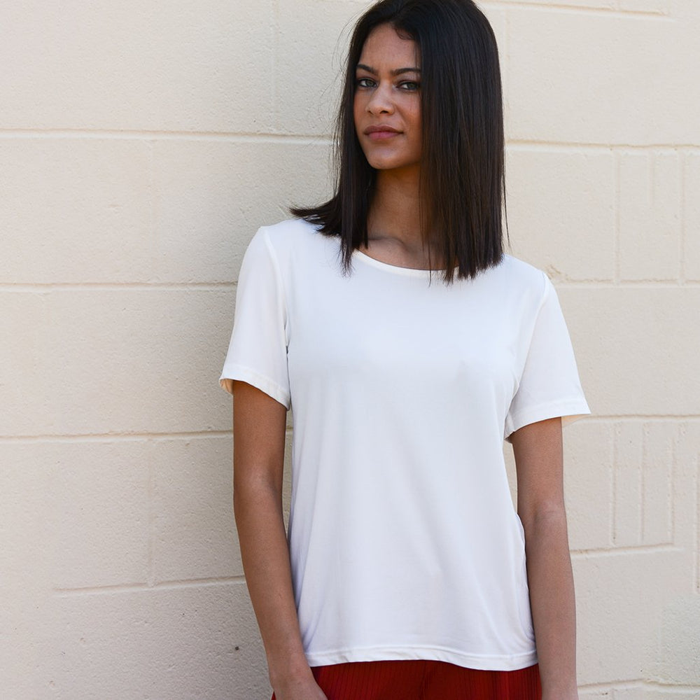This Sara Short Sleeve Basic Top is the perfect addition to your wardrobe. Made with super soft material and designed with a double stitched neckline, sleeve, and hem, this crew neck knit tee is a great basic piece for layering. Note: It runs a size smaller, so consider sizing up for a comfortable fit.