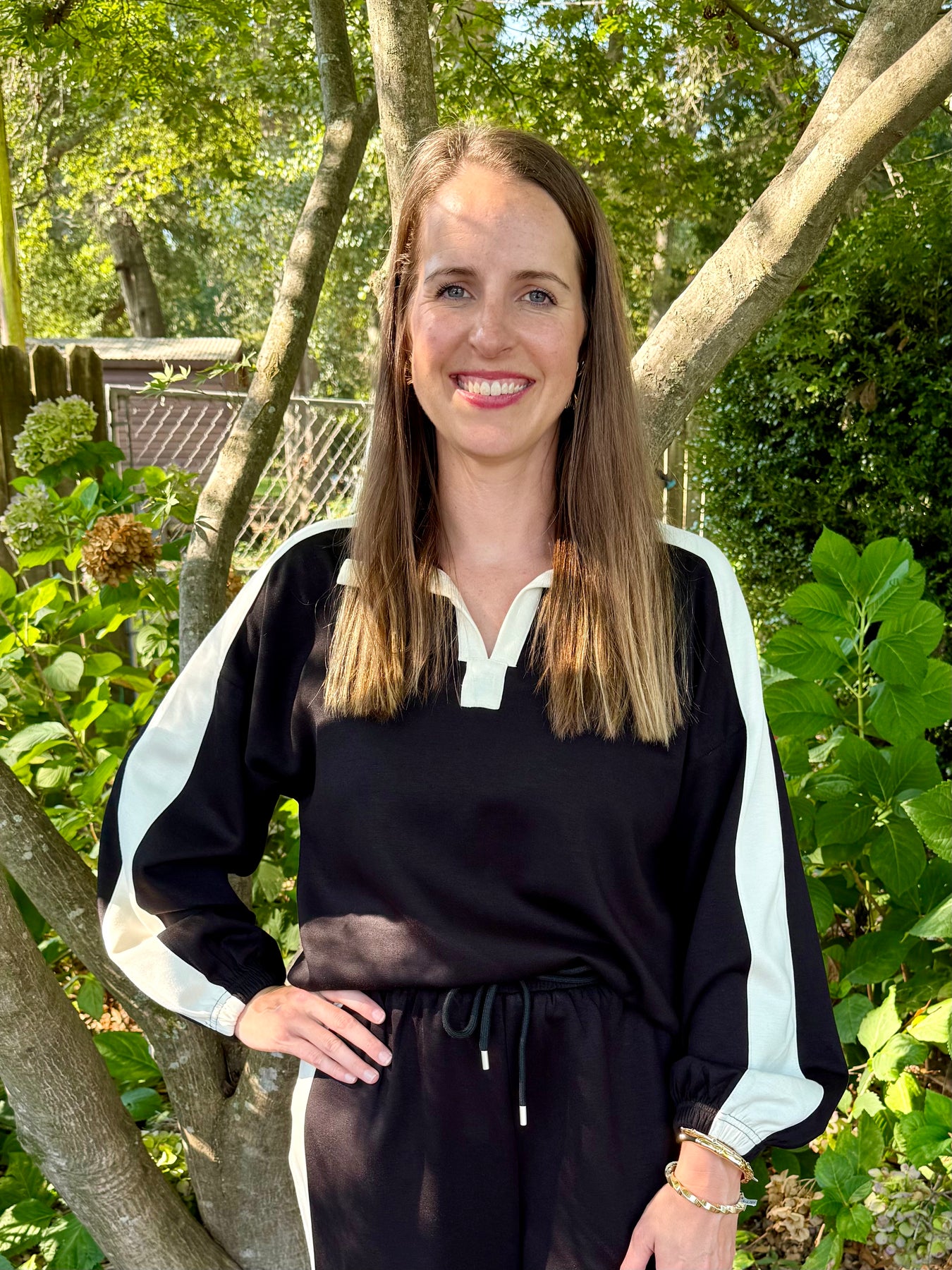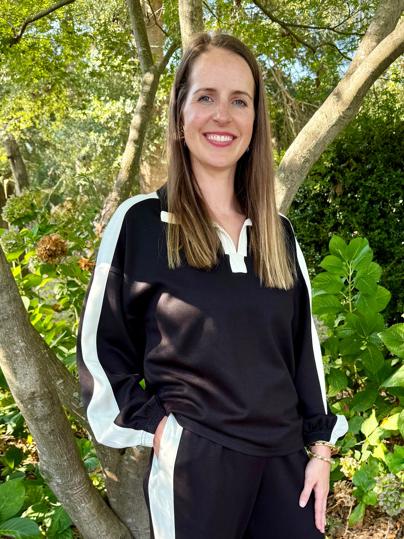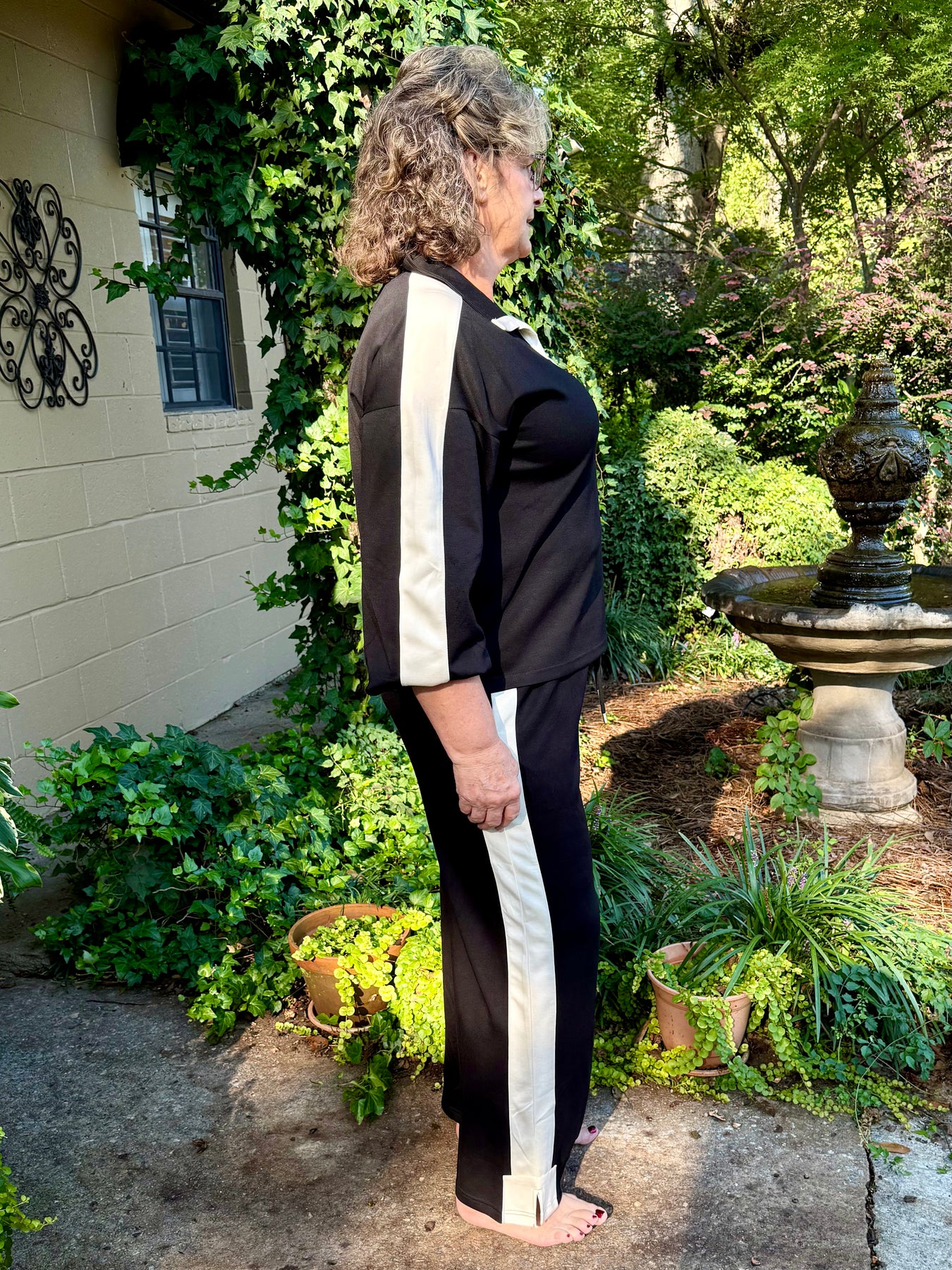 Say hello to your new off-duty obsession — the Vicki Comfy Pants. This sporty-chic staple is crafted in soft scuba fabric that feels as good as it looks. Designed in classic black with a bold ivory contrast stripe, drawstring waist with a wide leg and side pockets and slightly slit hem.