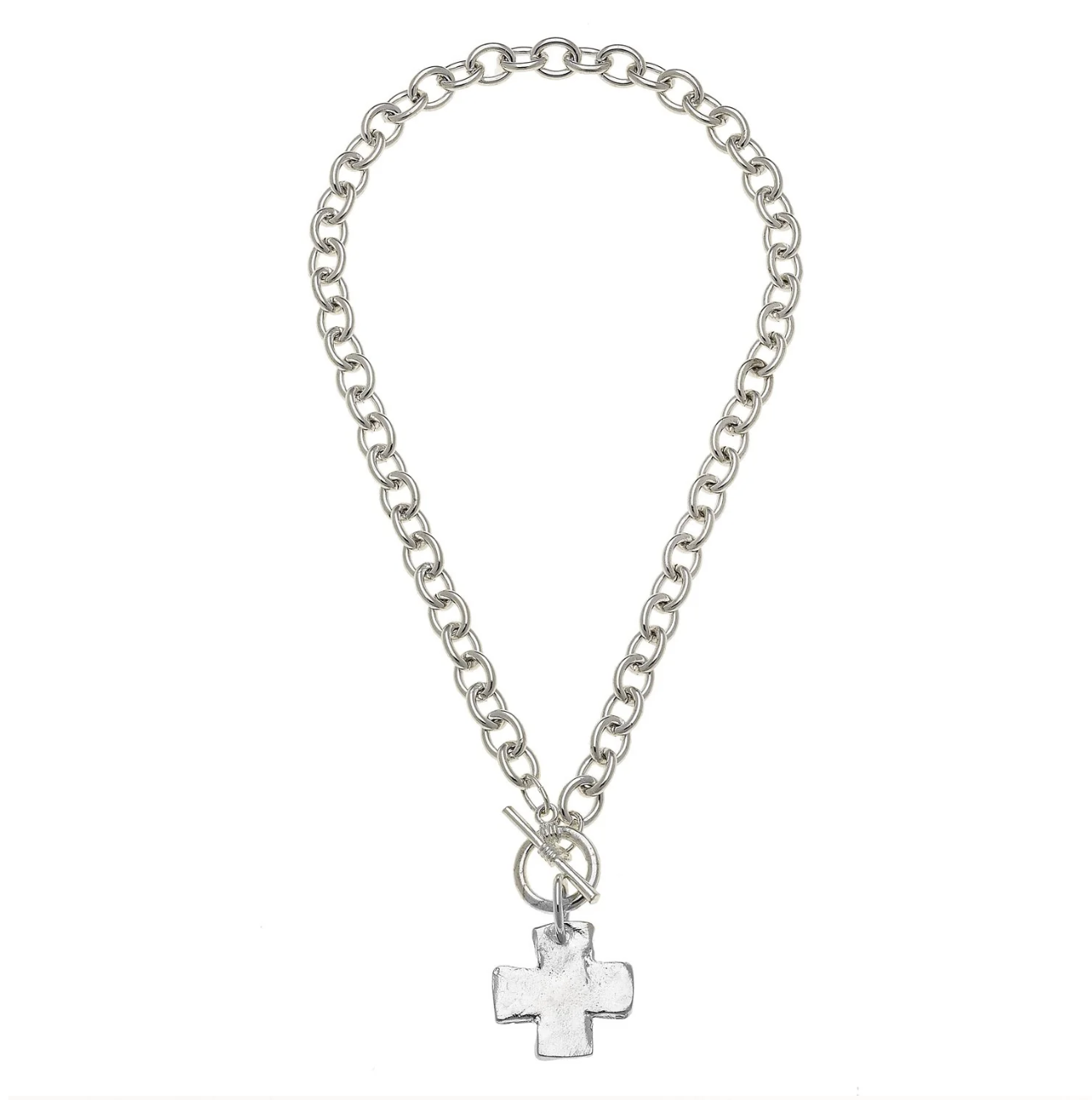 The Cross Toggle Necklace features a handcast square cross pendant, an iconic design originally created by Susan Shaw in 2002. This meaningful pendant is paired with our bestselling chain style, known for its substantial links and beautifully textured surface that catches the light with every movement.