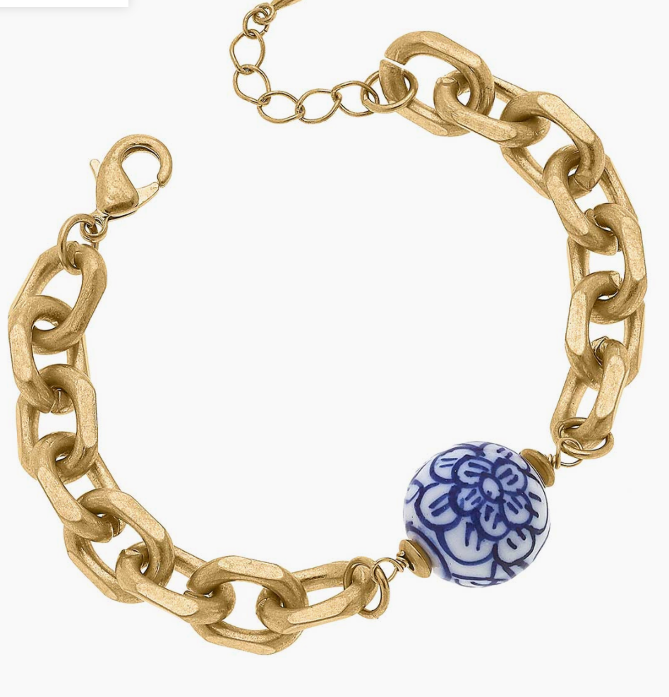 Want to add a classic touch to your wrist game? Our Carli Ball Bead Chunky Chain Bracelet in Worn Gold is perfect for mixing & matching with your fave bracelets & bangles! It also rocks solo for a statement look! Take your pick from two options: gold bead or blue & white chinoiserie bead. Worn Gold Plating.