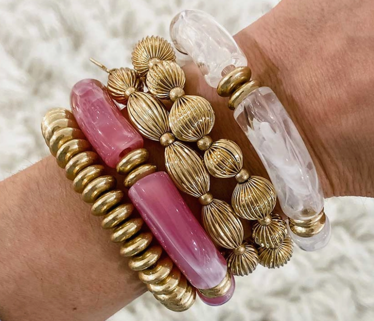 - Create eye-catching arm parties with the Channing Metal Plated Disc Bracelet in Worn Gold! Wear alone, or layer with other bracelets for easy, effortless style. Pictured with a beautiful bracelet stack.