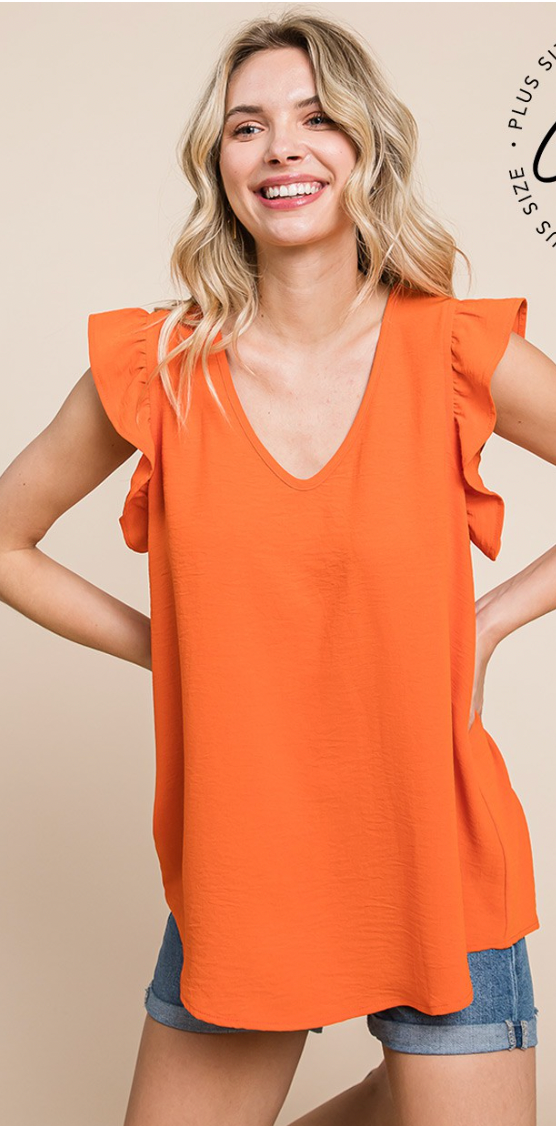 • Every girl needs a v neck top because it makes you looker slimmer and younger (at least that's what we've been told ;)). It's a beautiful short ruffle sleeve that looks great on every body type. True to size.