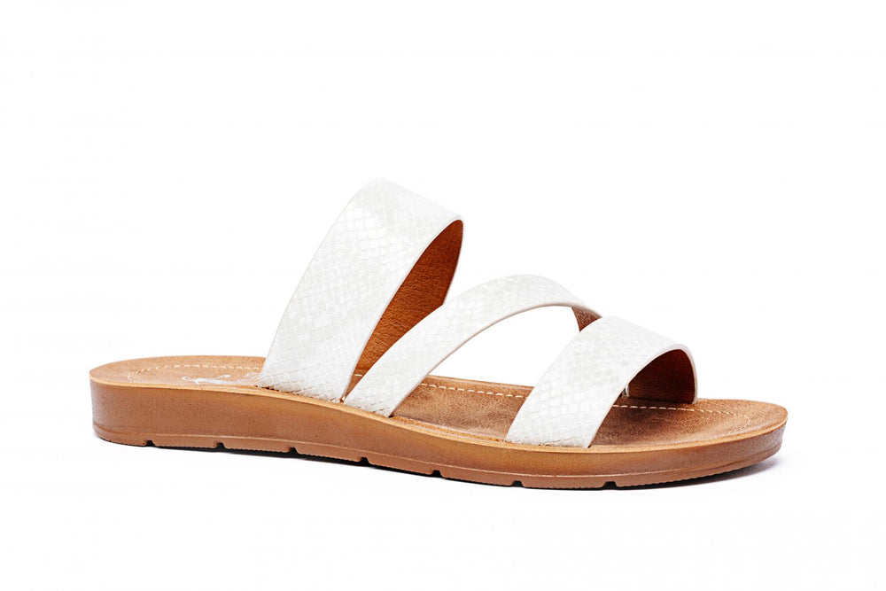 - Adorable multi strap sandal in a white and black snake color. Slide your foot into comfort with a cork foot bed. Perfect everyday slip on low heel sandal.