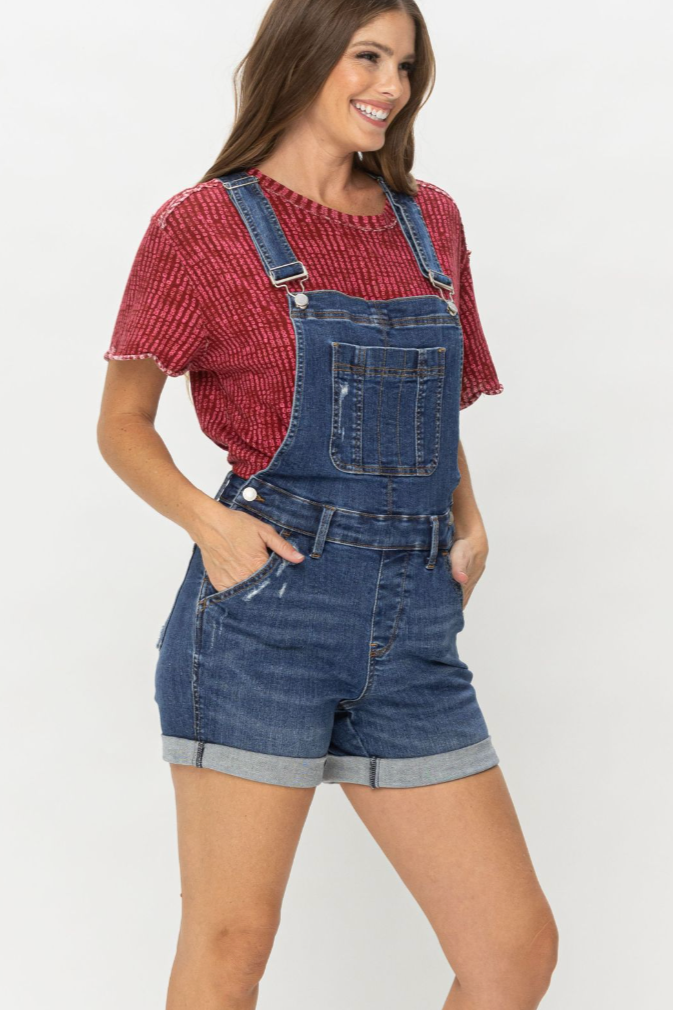 Channel your inner fashionista with our Judy Blue Overall Shorts. The light distressing adds a touch of edginess to these cute shorts, complete with a double cuffed rolled hem. And don't forget the versatility - you can wear them rolled up or down for different looks. With a front inseam of 11 inches and the ability to cuff them to 4.5 inches or uncuff to 7 inches, these shorts are the perfect addition to your summer wardrobe.