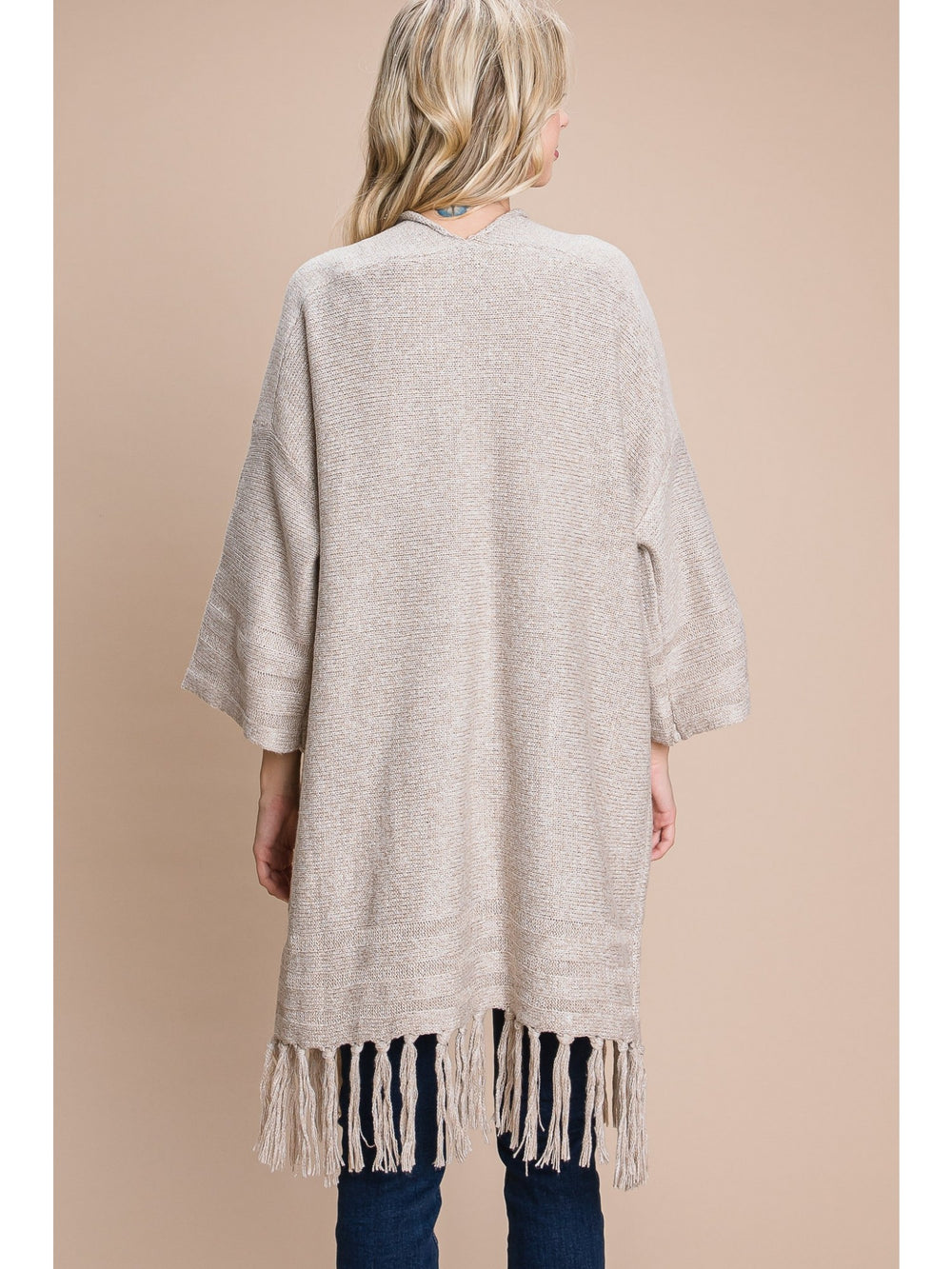 - What a fun solid knit cardigan with long sleeves featuring ribbed details, front pockets, and fringe hemline. You will be the center of attention with this beautiful and trendy sweater cardigan.