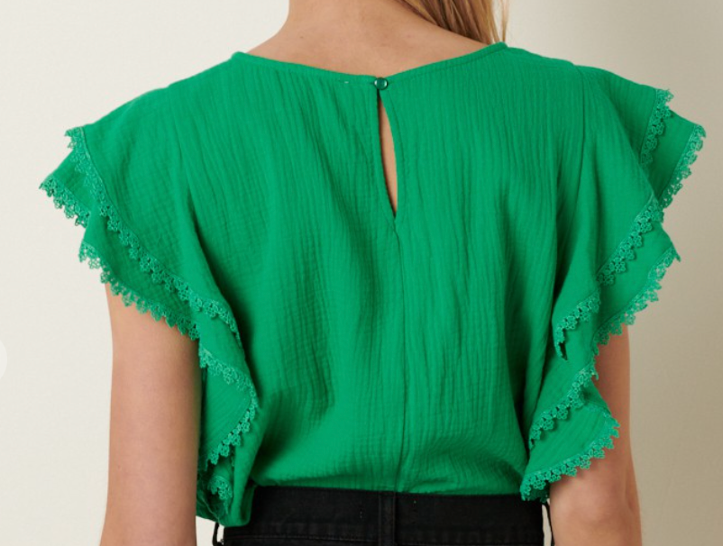 Super flattering and fun gauge woven fabric with a round neck and keyhole back with button. -Short ruffle sleeves with trim. Waist length (pictured with pink top). Runs small in the bust area.