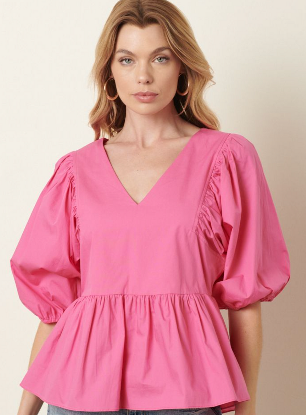 - What a classy poplin top with a v neck. Absolutely beautiful fabric with short dolman puffy sleeve and babydoll waistline. Has a hidden zipper closure in the back. This top screams classy. Perfect to wear dressy or casual with a pair of denims.
