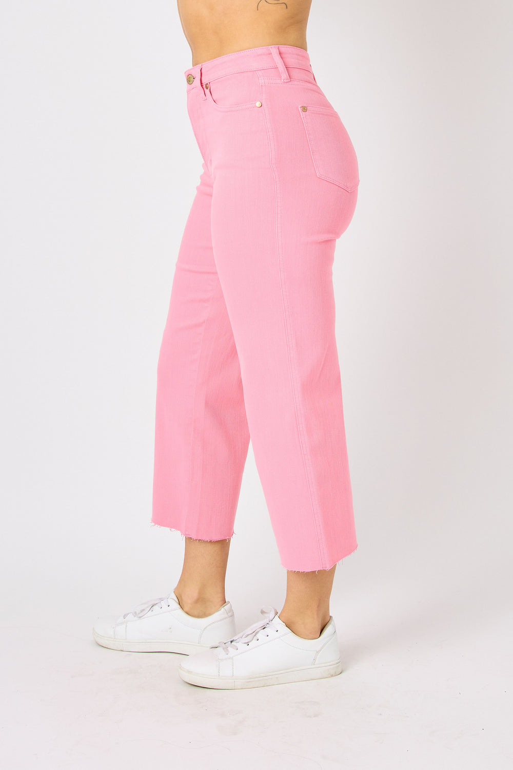Get these TRENDING Crop Jeans!!! Embrace the fun and flirty style of these Pinky Crop Wide Leg Jeans! Featuring a high waist and tummy control, these Judy Blue jeans offer a flattering fit while the pink garment dyed color adds a pop of personality. Plus, the frayed hem allows for easy customization by cutting them to your preferred length. Get your true Judy Blue size and rock these quirky jeans (no hemming necessary)! Final Sale.93% Cotton / 6% Polyester / 1% SpandexFINALFRONT RISE:11"INSEAM:24 3/4"