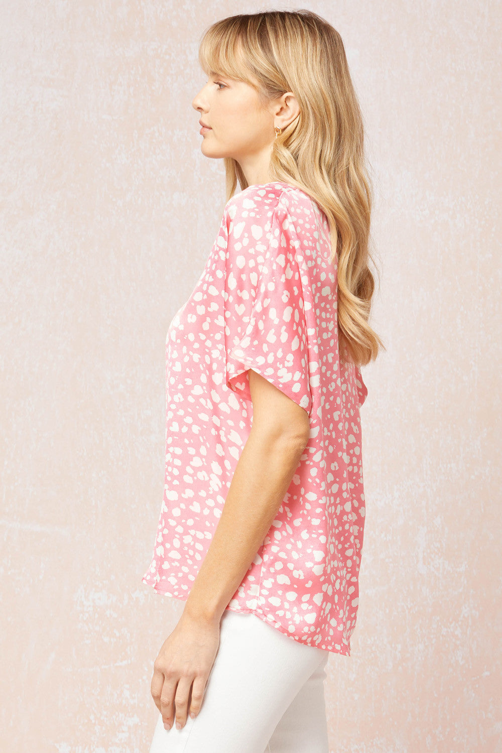 • Such a beautiful spotted satin v-neck short sleeve top. Unlined. Woven. Non-sheer. Lightweight.