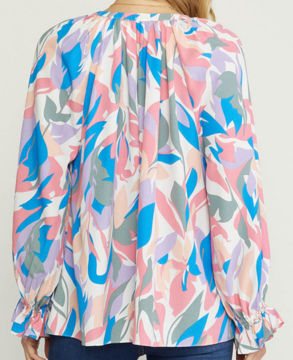 • A beautiful fun printed long sleeve v-neck top featuring button detail at front. Elastic at wrists. Unlined. Woven. Non-sheer. Lightweight. Available in regular and plus sizes.