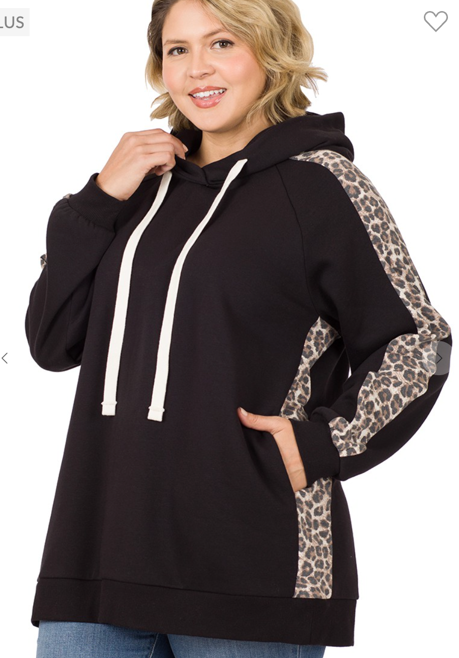 - Girls run don't walk to add this hoodie sweatshirt to your cart. Black with leopard side panels, leopard print down the long sleeves and best of all - POCKETS!! Available in small and plus sizes.