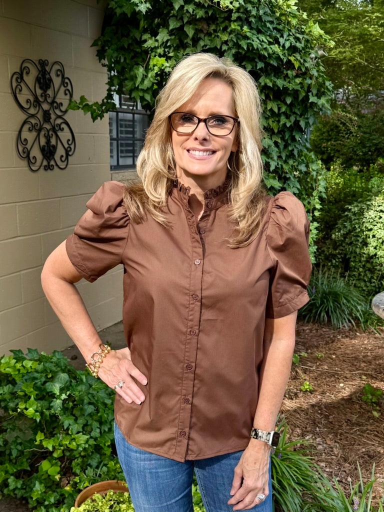 The Lillian Top takes “simple but stunning” to the next level. Featuring puff shoulders, a button-front closure, and a delicate ruffle band collar, this lightweight woven top is the perfect blend of feminine and chic. The rich solid brown hue makes it a versatile piece you can dress up or down with ease.