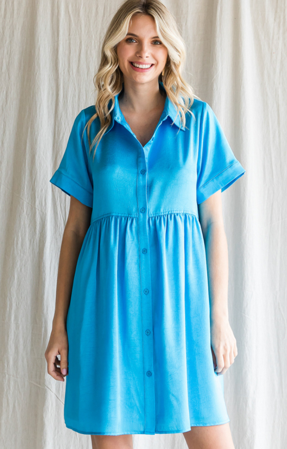 - What a beautiful satin drop waist dress. Solid turquoise button-up dress with collared neck and cuffed short sleeves. It looks great on all body types. Pair it with heels or cute sneakers. True to size with a loose fit.